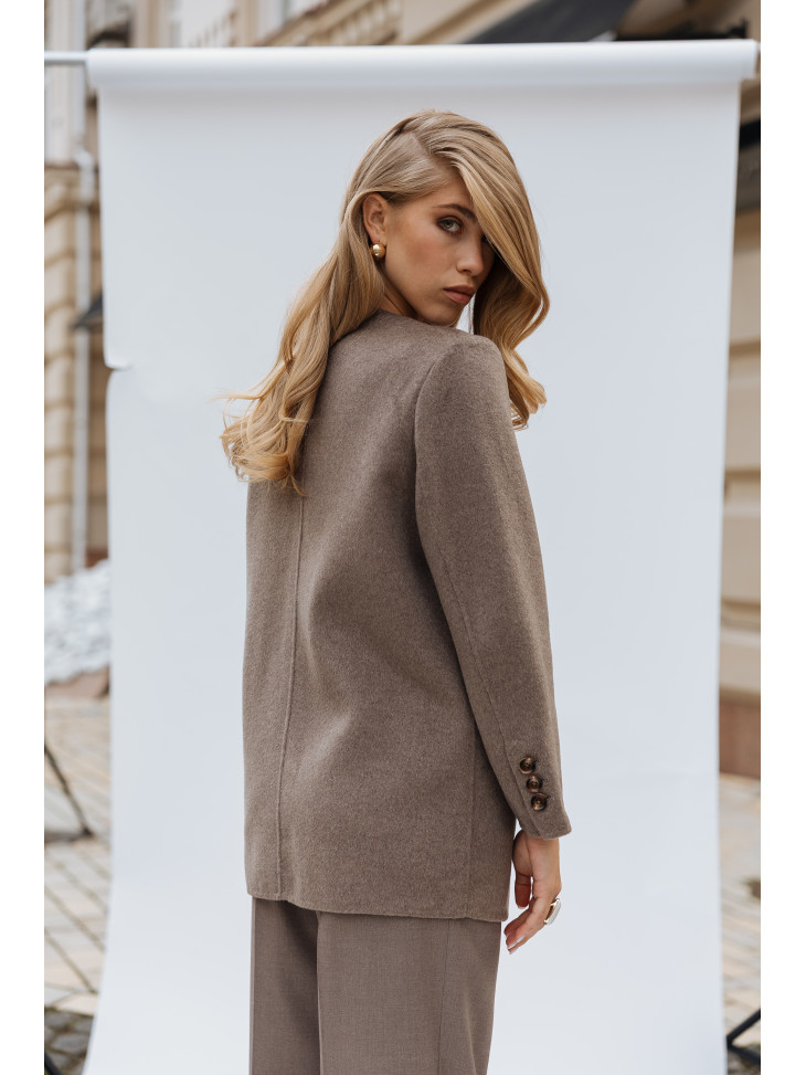 Модель із чіткою лінією плеча, глибоким V-вирізом та акцентними ґудзиками створює витончений, зібраний образ. Благородний сіро-коричневий відтінок легко поєднується з базовим гардеробом і виглядає доречно як у ділових, так і в повсякденних стилізаціях.