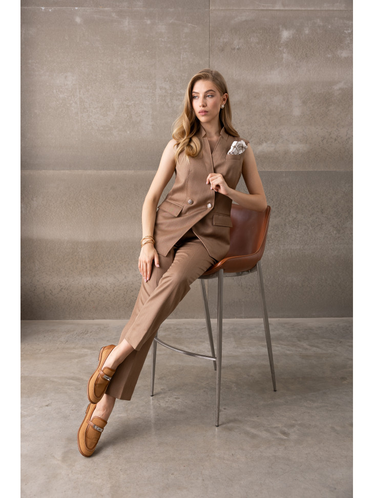 Склад : 100% Вовна. Жіночий костюм із жилетом без рукавів та класичними брюками. Подовжений жилет із V-подібним вирізом і декоративною застібкою додає витонченості, а брюки прямого крою забезпечують комфорт та елегантність. Актуальний відтінок теплого бежу робить комплект універсальним вибором як для ділових подій, так і для щоденного міського стилю.