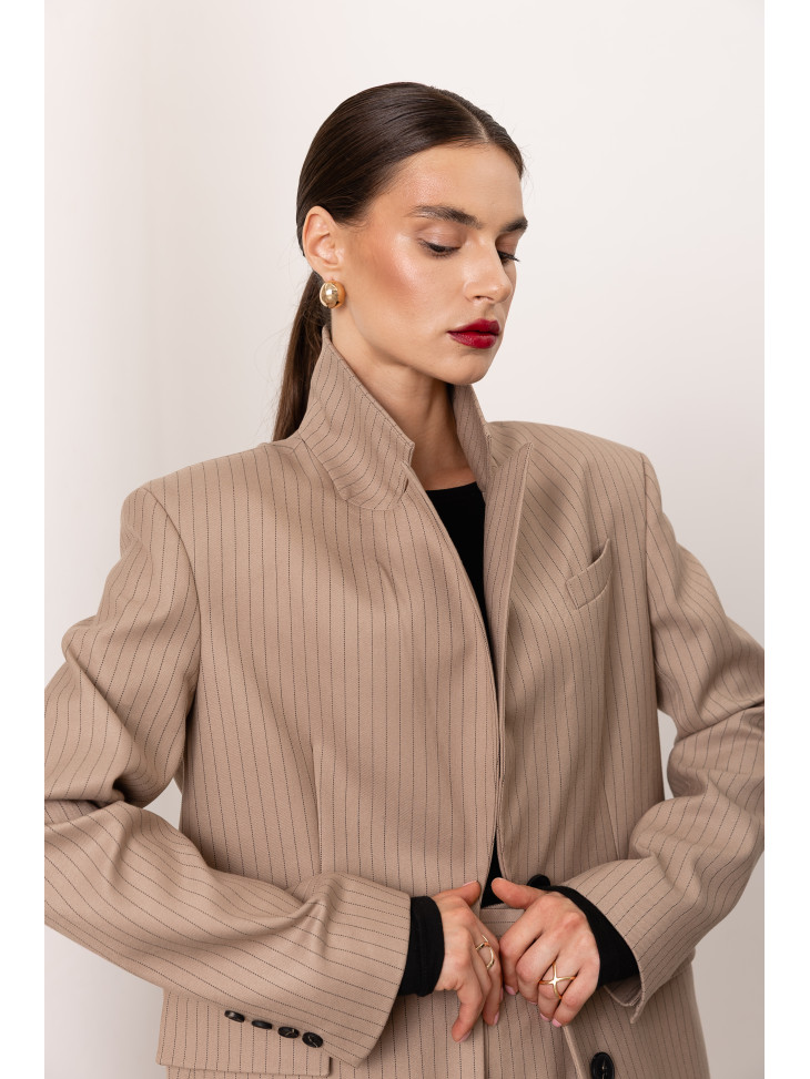 Жіночий костюм із подовженим жакетом та шортами у тонку смужку. Теплий бежевий відтінок у поєднанні з вертикальною смужкою робить костюм універсальним вибором для ділових зустрічей і стильних прогулянок містом.