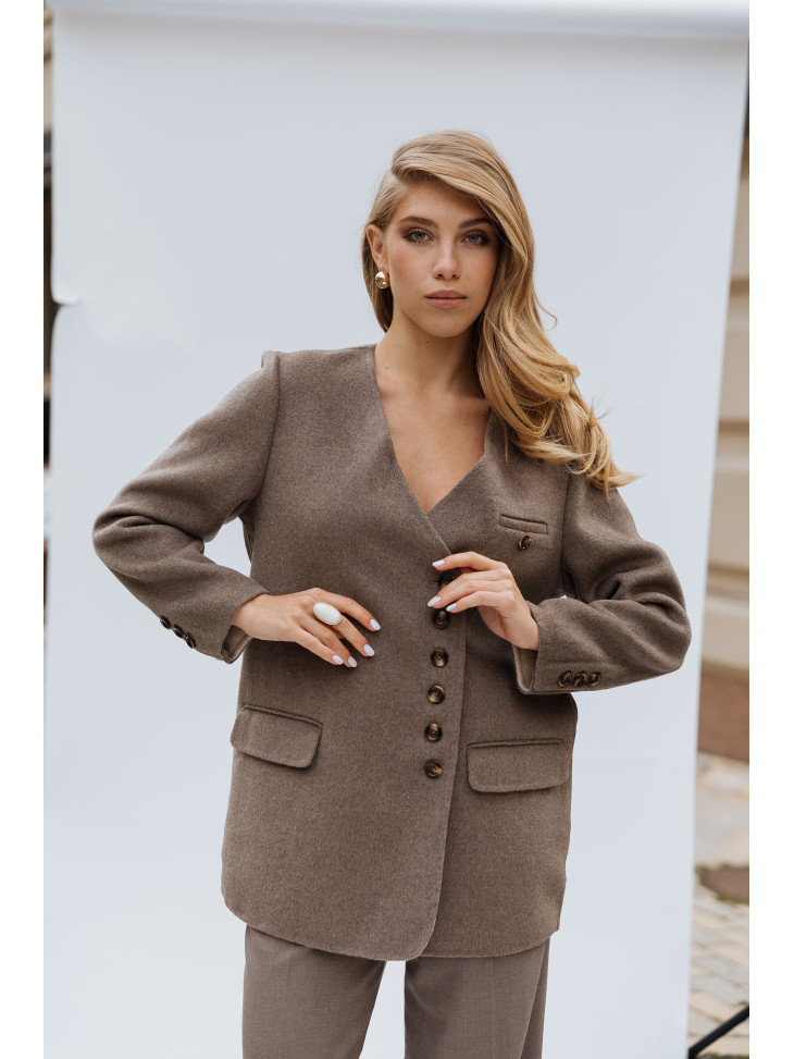 Модель із чіткою лінією плеча, глибоким V-вирізом та акцентними ґудзиками створює витончений, зібраний образ. Благородний сіро-коричневий відтінок легко поєднується з базовим гардеробом і виглядає доречно як у ділових, так і в повсякденних стилізаціях.